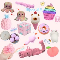 스트레스 해소 장난감 핑크 15pcs 세트 푸쉬팝 악력고리 큐브 버블건 양면 문어 수납 가방 증정