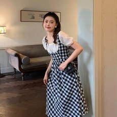마카다 마카판다 소녀감성 복고풍 스퀘어 컬러 체크 무늬 원피스 1056