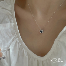 Celia 실버 순은 큐빅 블랙 하트 목걸이
