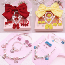 리본 진주 인어 7종 악세사리 세트 여아동 키즈 초등 머리핀 목걸이 반지 귀찌 팔찌, 인어리본세트, 조개블루(리오더)