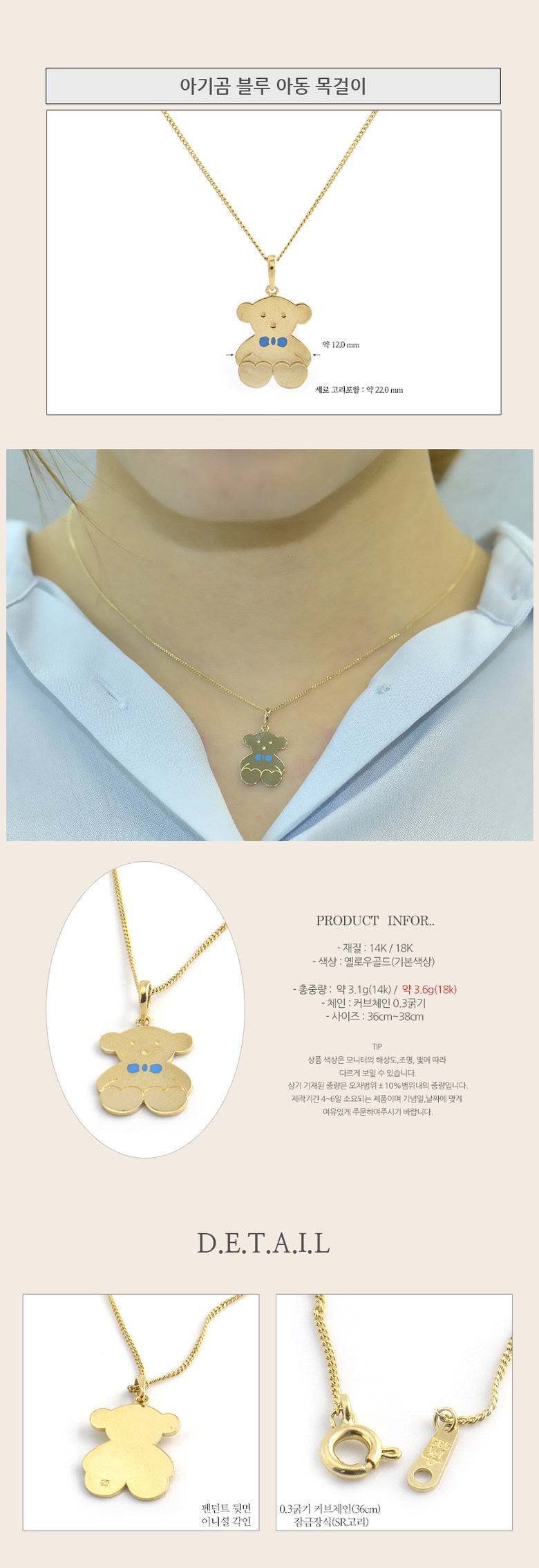 나라주얼리 14k 18k 아기곰 블루 아동 목걸이, 18k옐로골드