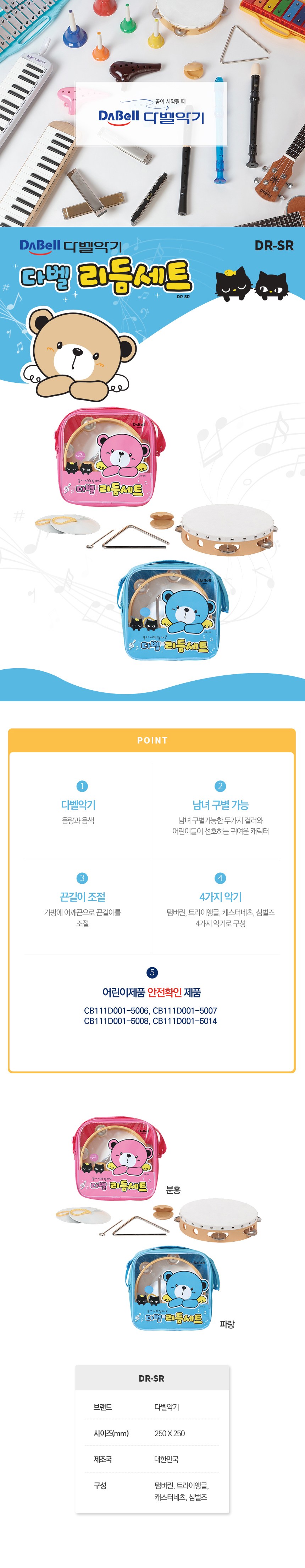 | KC 인증 필 유무 | 캐스터네츠 : CB111D001-5006 / 트라이앵글 : CB111D001-5007 / 탬버린 : CB111D001-5008 / 심벌즈 : CB111D001-5014 |