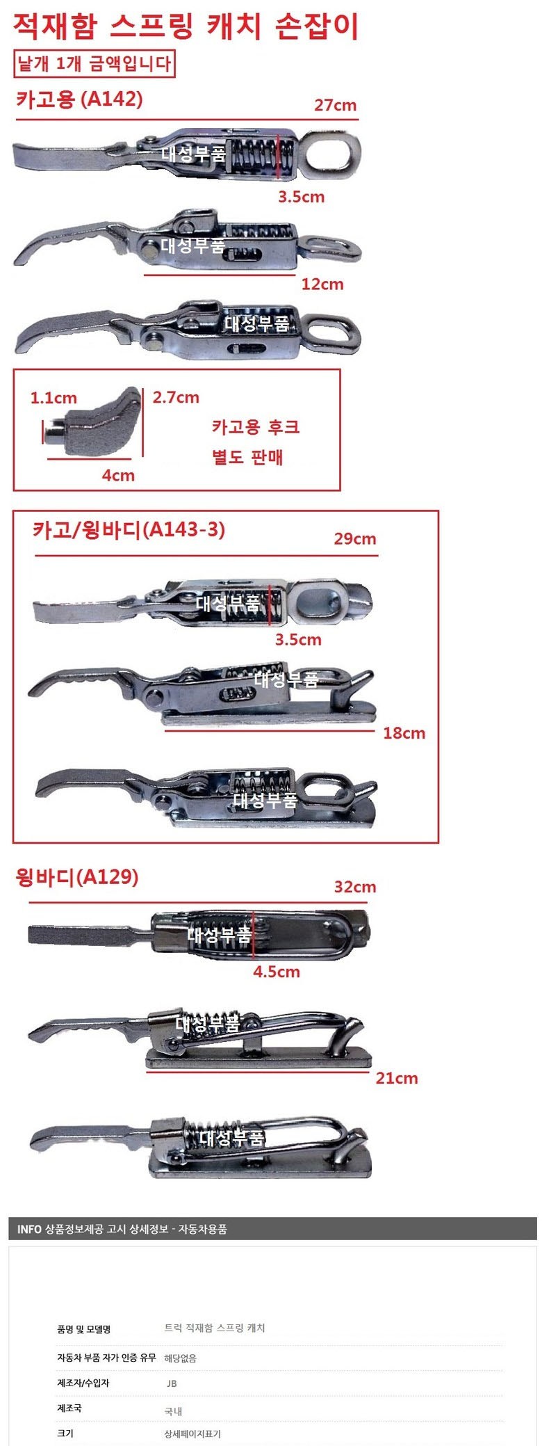 대성부품 윙바디 스프링 윙바디 부품 탑차 부품 카고 적재함 스프링 중간 말뚝 스프링 화물차 대형트럭 중간 기둥 말뚝 중간 캐치 손잡이 특장차 개조 메가 트라고 프리마 파워텍 노브스, 캐치 윙바디(A129)