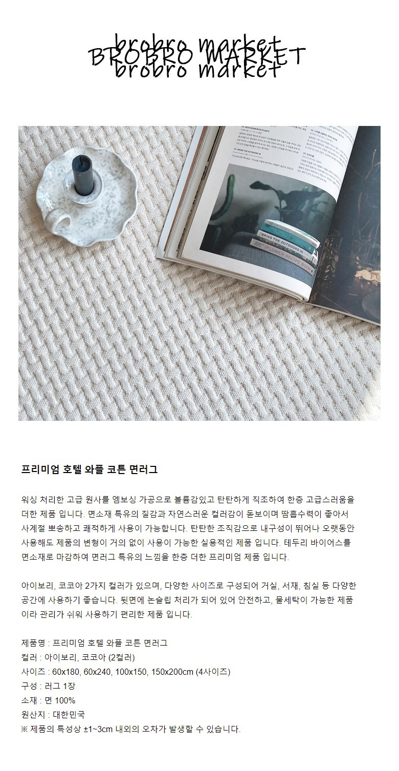 브로브로 프리미엄 호텔 와플 코튼 면 러그, 아이보리