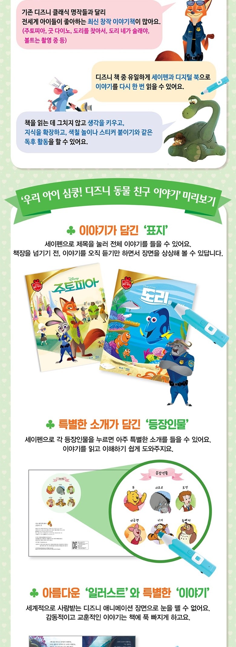 | 목차 또는 책소개(아동용 학습 교재의 경우 사용연령을 포함) | [블루앤트리] 우리 아이 심쿵! 디즈니 동물친구이야기 |