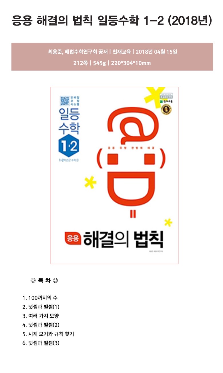 목차 또는 책소개(아동용 학습 교재의 경우 사용연령을 포함) [천재교육] 응용 해결의 법칙 일등수학 1-2 (2018년)