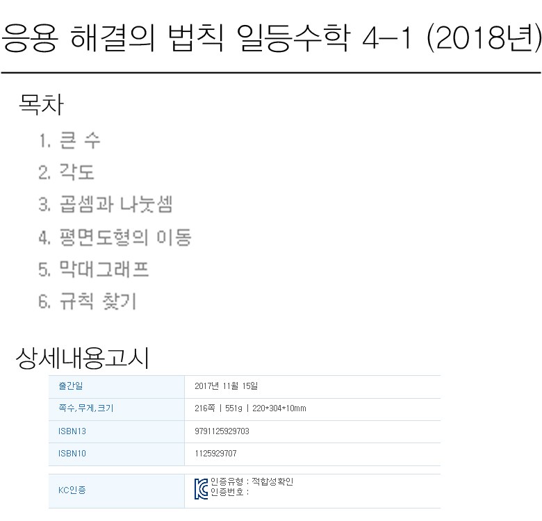 목차 또는 책소개(아동용 학습 교재의 경우 사용연령을 포함) [천재교육] 응용 해결의 법칙 일등수학 4-1 (2018년)