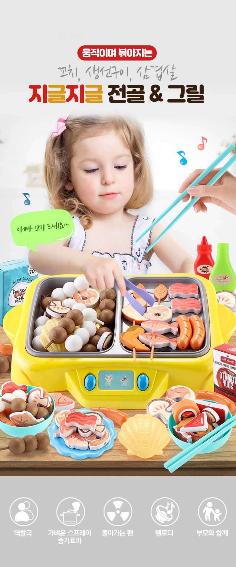 저스트굿 움직이며 볶아지는 지글지글 전골 그릴 냄비 요리놀이 쿠킹 유아 아기 주방놀이세트 소꿉놀이세트 쿠킹세트 꼬치 삼겹살 쿠킹플레이 부엌놀이, 핑크