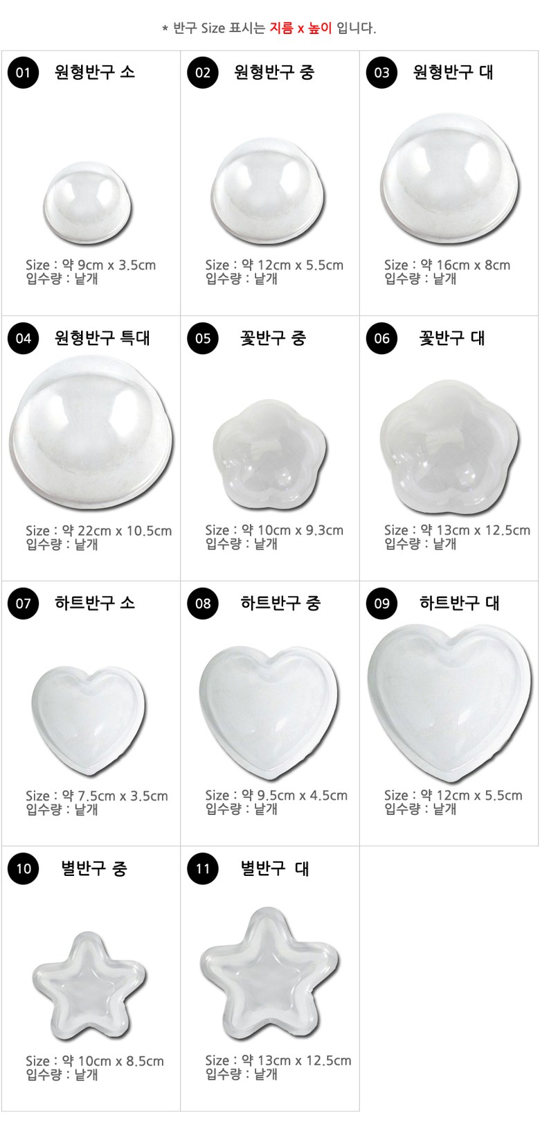 | 품명 및 모델명 | 투명반구 아크릴돔 소 중 대 특대 플라스틱반구 원형 하트 꽃 별 |