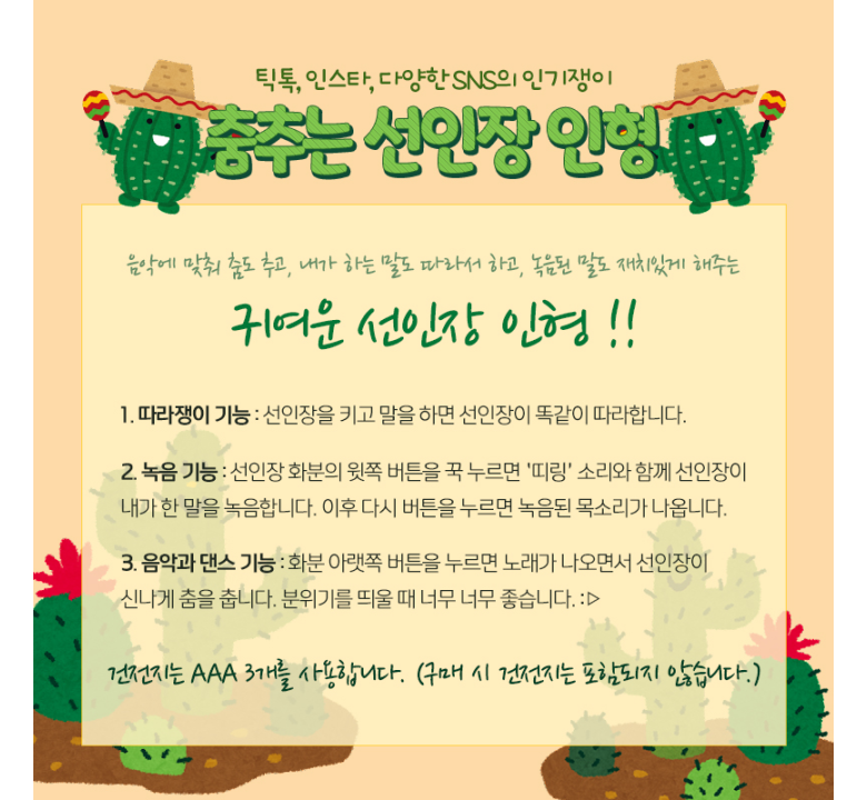 틱톡 핵인싸 4종 춤 추는 선인장 홈파티 인테리어, 노랑모자