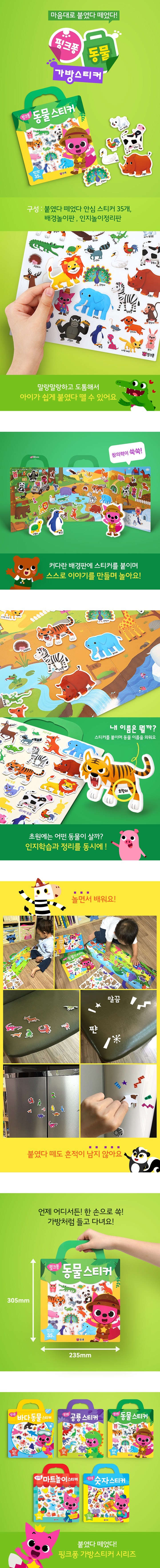 | 목차 또는 책소개(아동용 학습 교재의 경우 사용연령을 포함) | – 여러 번 떼었다 붙였다 할 수 있는 안심스티커 – 아이가 사용하기 편한 말랑하고 도톰한 소재 – 스티커마다 이름을 표기 해 인지학습에 적합함 – 핑크퐁 영상 속 캐릭터로 아이들의 흥미 유발 – 휴대하기 편리한 가방모양 디자인 |