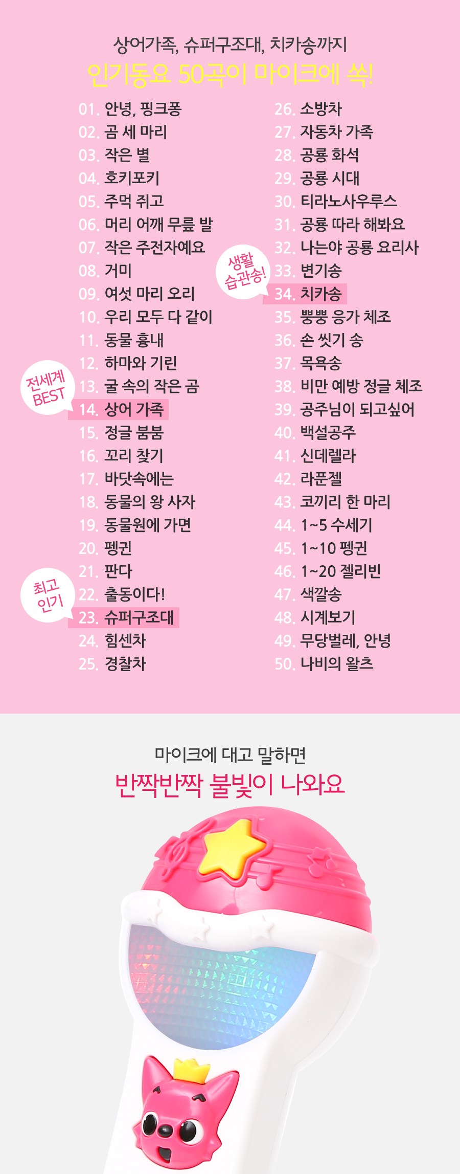 | 목차 또는 책소개(아동용 학습 교재의 경우 사용연령을 포함) | 핑크퐁 마이크 – 인기동요 50 |