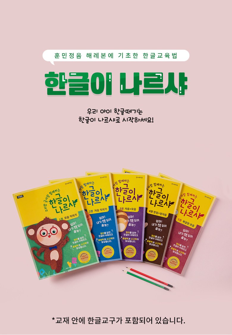 | 제품 구성 | 1권 모음익히기2권 자음익히기 3권 자음+모음 4권 받침+쌍자음5권 복잡한 모음 익히기 |