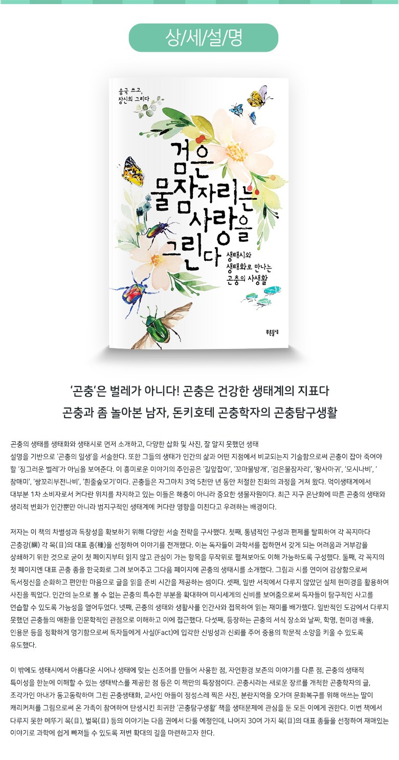 | 목차 또는 책소개(아동용 학습 교재의 경우 사용연령을 포함) | 이 책은 흔히 볼 수 있는 곤충도감 류와 달리 곤충의 생태를 생태화와 생태시로 먼저 소개하고, 다양한 삽화 및 사진, 잘 알지 못했던 생태 설명을 기반으로 ‘곤충의 일생’을 서술한다. 또한 그들의 생태가 인간의 삶과 어떤 지점에서 비교되는지 기술함으로써 곤충이 잡아 죽여야 할 ‘징그러운 벌레’가 아님을 보여준다. 이 흥미로운 이야기의 주인공은 ‘길앞잡이’, ‘꼬마물방개’, ‘검은물잠자리’, ‘왕사마귀’, ‘모시나비’, ‘참매미’, ‘쌍꼬리부전나비’, ‘흰줄숲모기’이다. 곤충들은 자그마치 3억 5천만 년 동안 처절한 진화의 과정을 거쳐 왔다. 먹이생태계에서 대부분 1차 소비자로서 커다란 위치를 차지하고 있는 이들은 해충이 아니라 중요한 생물자원이다. 최근 지구 온난화에 따른 곤충의 생태와 생리적 변화가 인간뿐만 아니라 범지구적인 생태계에 커다란 영향을 미친다고 우려하는 배경이다. 저자는 이 책의 차별성과 독창성을 확보하기 위해 다양한 서술 전략을 구사했다. |