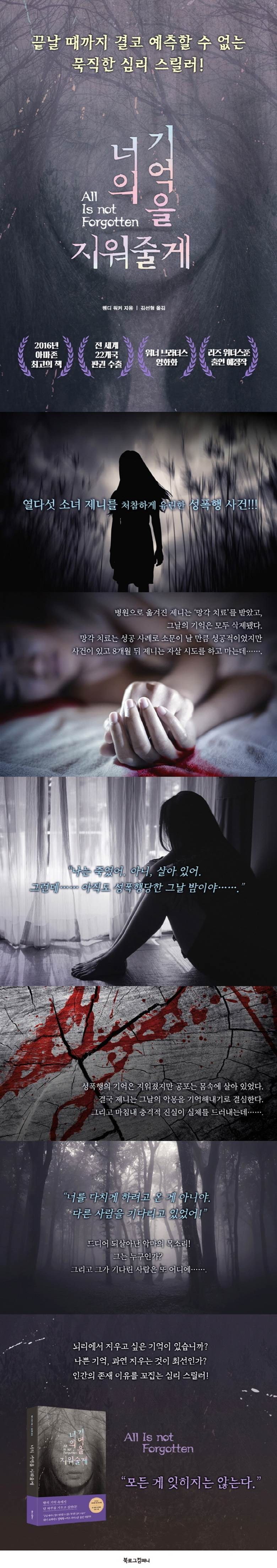 목차 또는 책소개(아동용 학습 교재의 경우 사용연령을 포함) 웬디 워커의 『너의 기억을 지워줄게』. 놈은 파티장에서 나온 열다섯 소녀 제니 크레이머를 쫓아 집 뒤편 숲으로 들어갔다. 바싹 마른 잔가지들이 노인의 뼈처럼 뚝뚝 부러지며 엎어진 제니의 맨무릎을 마구 할퀴었다. 놈은 팔뚝으로 우악스럽게 제니를 찍어눌렀다. 강간은 한 시간 가까이 이어졌다. 파티장에서 쩌렁쩌렁 울리는 요란한 음악소리와 낮은 웃음 소리, 범인의 타락한 숨소리와 제니의 목에서 나오는 애끓는 비명 소리가 뒤섞인 그날 밤. 끔찍한 절규가 울려 퍼졌고, 결국 그 소리를 들은 누군가가 달려왔다. 그러나 놈은 사라진 후였다. 병원으로 옮겨진 제니는 어머니 샬럿의 결정으로 ‘외상 후 스트레스’를 최소화하기 위해 끔찍한 트라우마를 지워버리는 ‘망각 치료’를 받게 된다. 그러나 혹자들이 ‘기적’의 치료라고 하는 그 요법은 마술이 아니었다. 제니에게서 거품처럼 보글거리던 즐거움이 싹 사라졌고, 8개월 후 제니는 자살 시도를 하게 되는데…