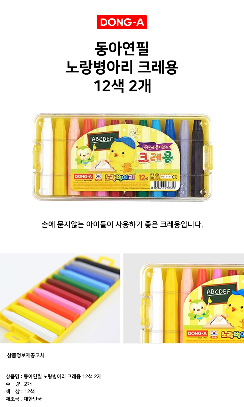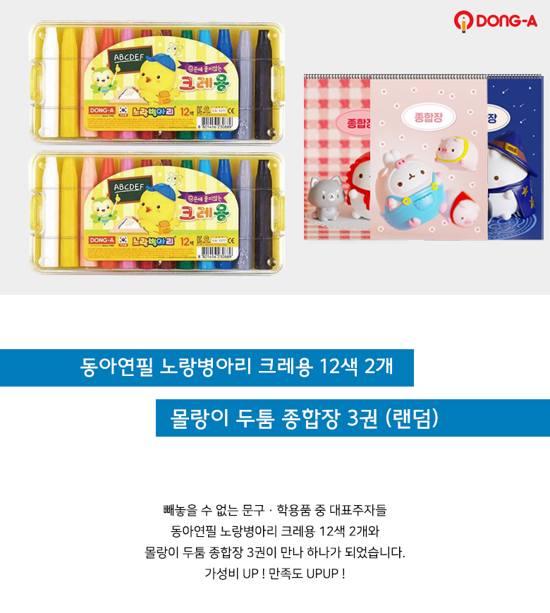 | 품명 및 모델명 | 동아연필 노랑병아리 크레용 12색 2개 + 몰랑이 두툼 종합장 3권 (랜덤) |