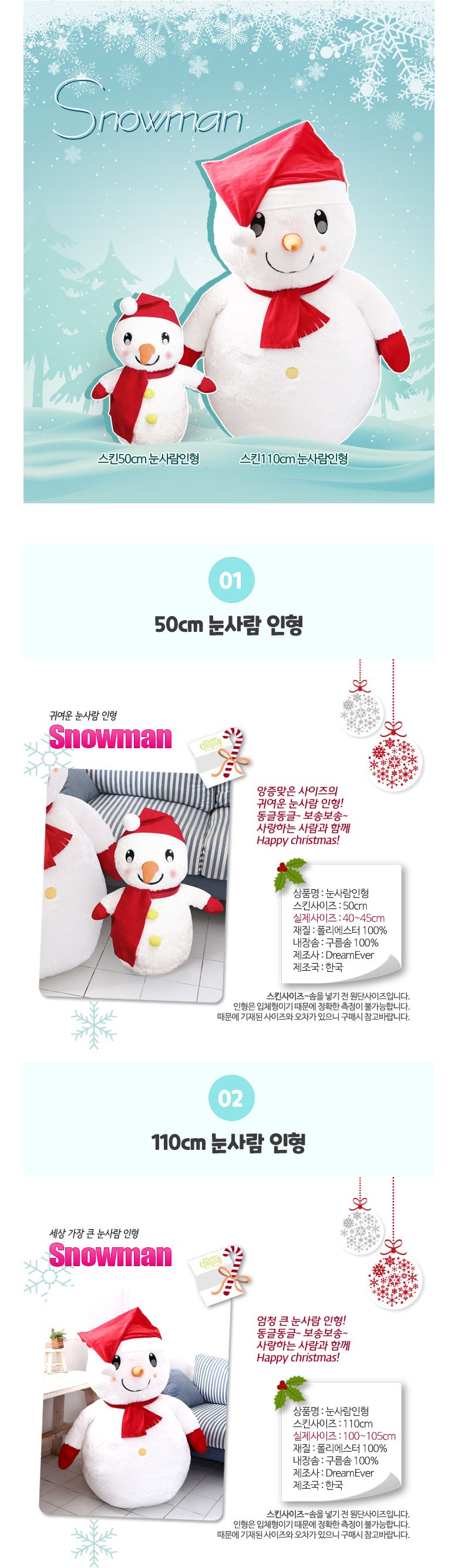 드림에버 대형 눈사람인형 화이트 110cm 50cm 크리스마스 선물 큰인형, 선택01_50cm