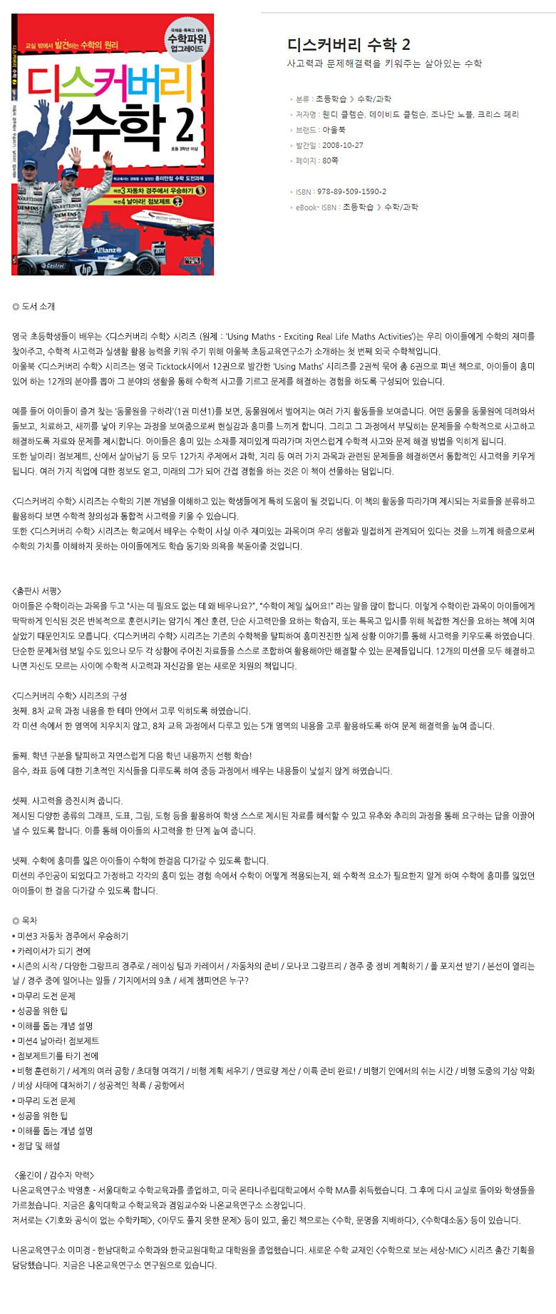 | 목차 또는 책소개(아동용 학습 교재의 경우 사용연령을 포함) | 「디스커버리 수학」 시리즈는 수학의 기본 개념을 이해하고 있는 학생들에게 특히 도움이 될 것입니다. 이 책의 활동을 따라가며 제시되는 자료들을 분류하고 활용하다 보면 수학적 창의성과 통합적 사고력을 키울 수 있습니다. 또한 「디스커버리 수학」 시리즈는 학교에서 배우는 수학이 사실 아주 재미있는 과목이며 우리 생활과 밀접하게 관계되어 있다는 것을 느끼게 해줌으로써 수학의 가치를 이해하지 못하는 아이들에게도 학습 동기와 의욕을 북돋아줄 것입니다. |