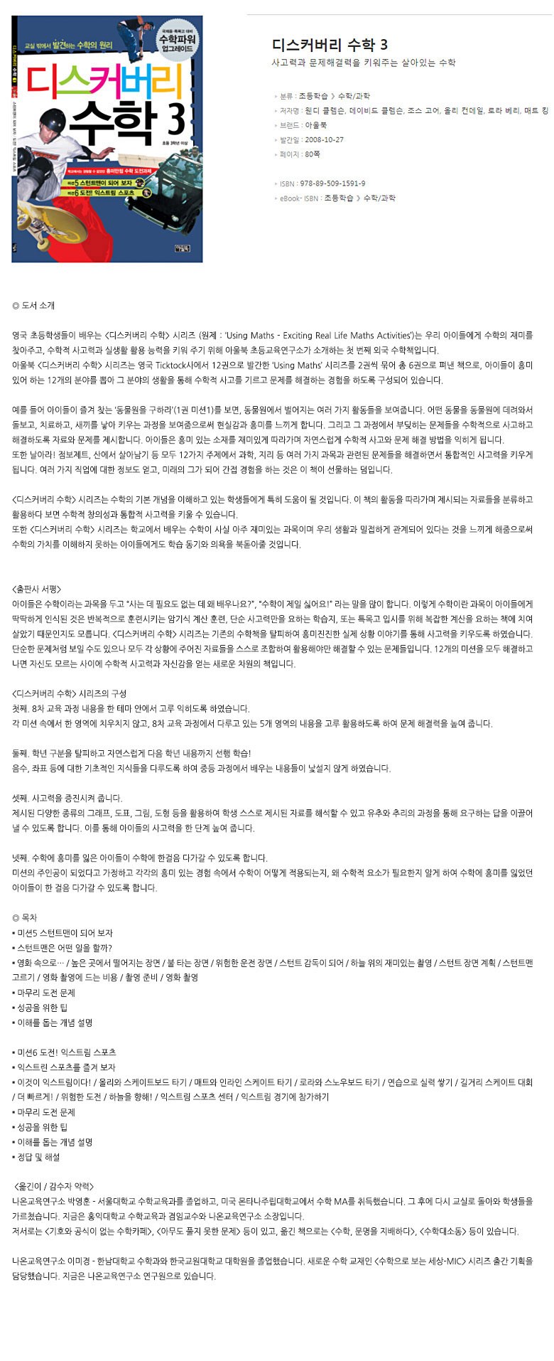 목차 또는 책소개(아동용 학습 교재의 경우 사용연령을 포함) 「디스커버리 수학」 시리즈는 수학의 기본 개념을 이해하고 있는 학생들에게 특히 도움이 될 것입니다. 이 책의 활동을 따라가며 제시되는 자료들을 분류하고 활용하다 보면 수학적 창의성과 통합적 사고력을 키울 수 있습니다. 또한 「디스커버리 수학」 시리즈는 학교에서 배우는 수학이 사실 아주 재미있는 과목이며 우리 생활과 밀접하게 관계되어 있다는 것을 느끼게 해줌으로써 수학의 가치를 이해하지 못하는 아이들에게도 학습 동기와 의욕을 북돋아줄 것입니다.