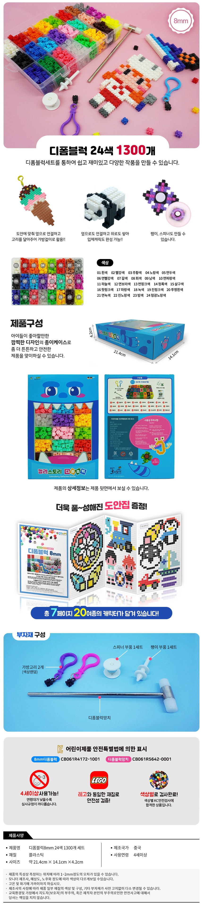 디폼블럭 24색 1300개 + 도안 + 망치 + 부자재 S02 8mm, 혼합색상