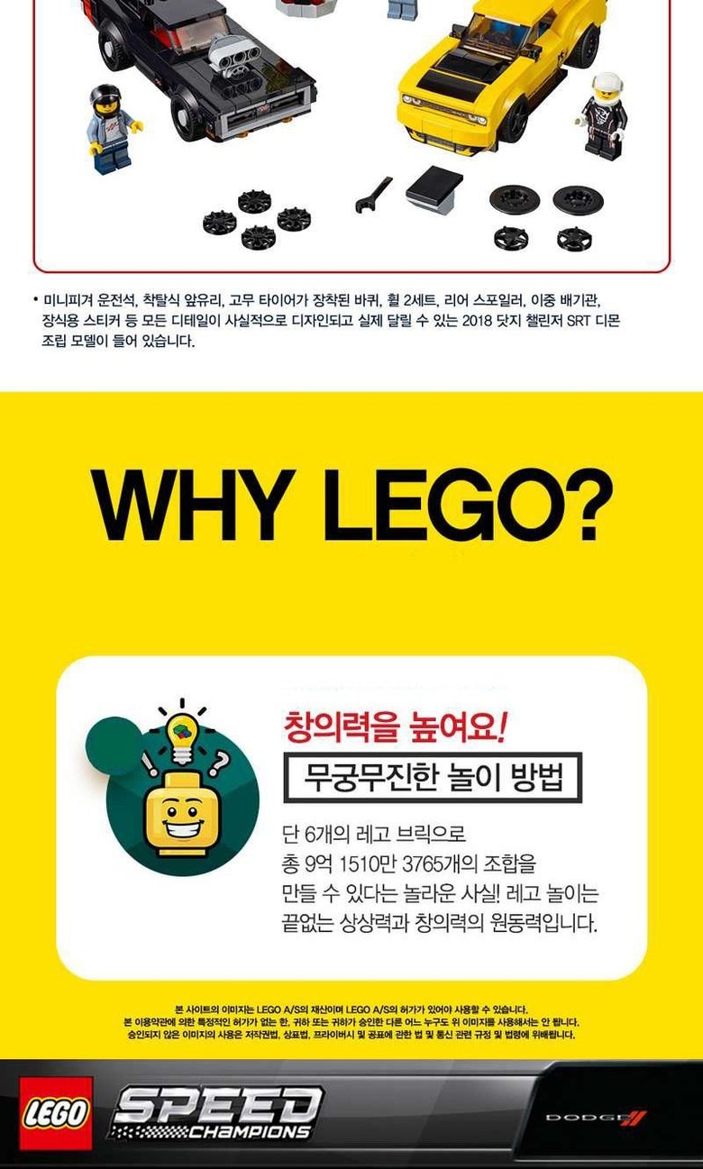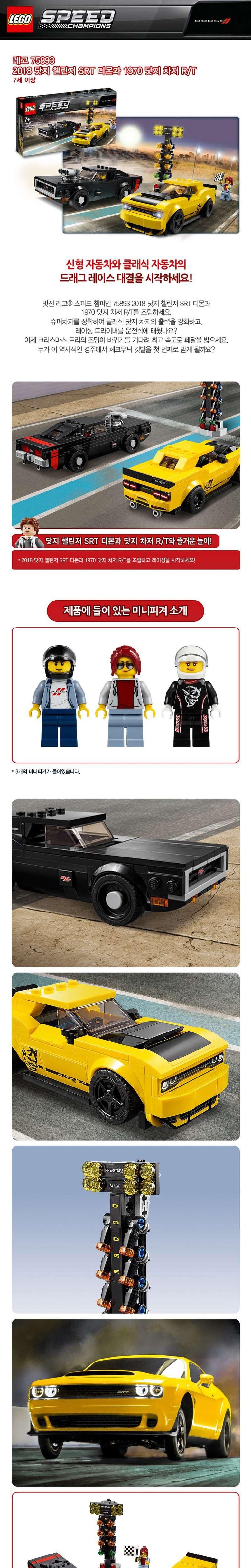 레고 스피드챔피언 2018 닷지 챌린저 SRT 디몬과 1970 닷지 차저 R/T 완구 75893, 혼합 색상