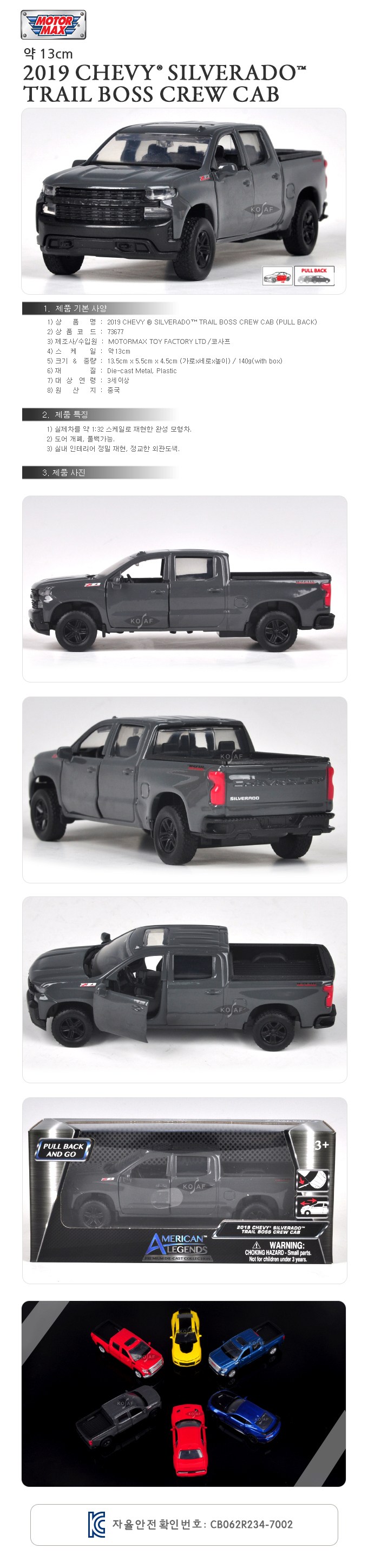 모터맥스 2019 쉐보레 실버라도 트레일보스 크루캡 다이캐스트 풀백미니카 540M73677CSGY, 혼합색상