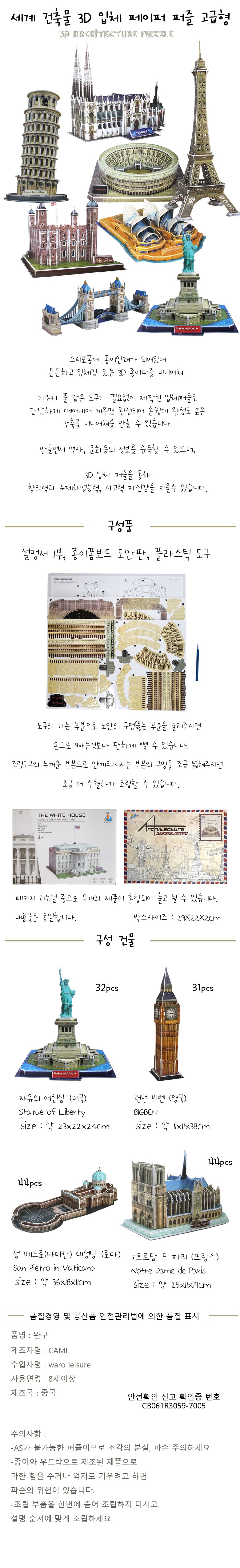 | 품명 및 모델명 | 토이진 세계 건축물 3D 퍼즐 고급형 4종 (자유의여신상,노트르담파리,성배드로대성당,런던빅벤) |