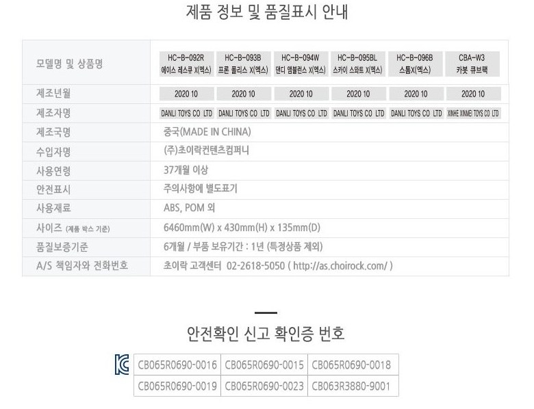 | 제조자(수입자) | DANLITOYS/초이락컨텐츠팩토리 |