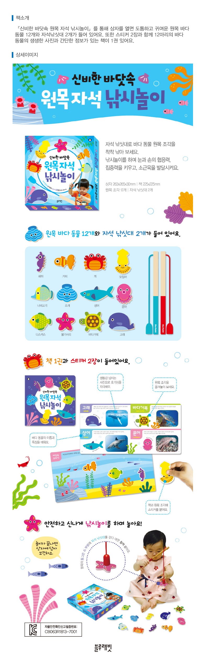 | 목차 또는 책소개(아동용 학습 교재의 경우 사용연령을 포함) | 『신비한 바닷속 원목 자석 낚시놀이』를 통해 상자를 열면 도톰하고 귀여운 원목 바다 동물 12개와 자석낚싯대 2개가 들어 있어요. 또한 스티커 2장과 함께 12마리의 바다 동물의 생생한 사진과 간단한 정보가 있는 책이 1권 있어요. |