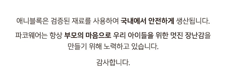 | 취급방법 및 취급시 주의사항, 안전표시 | 예상치 못한 사고의 위험이 있으므로 보호자와 함께 놀이해 주세요.질식의 위험이 있으므로 작은 제품은 절대로 입에 넣지 마세요.제품 위에 올라가거나 던지지 마세요.화기에 가까이하지 마세요.제품을 삶거나 무리한 힘을 가하지 마세요. |