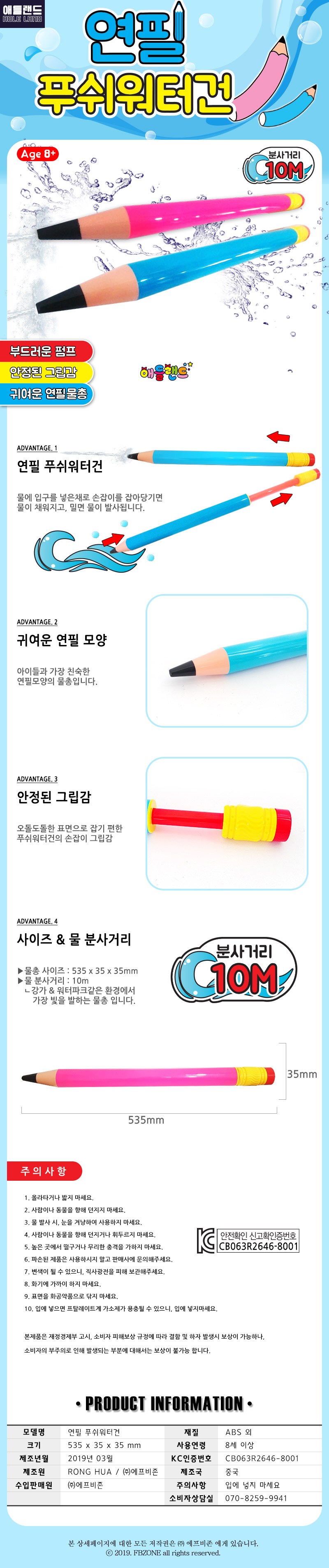| 품명 및 모델명 | 애들랜드 물총 연필푸쉬워터건 블루 |