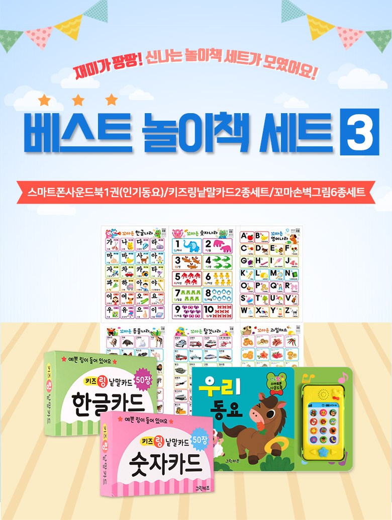| 목차 또는 책소개(아동용 학습 교재의 경우 사용연령을 포함) | [그린키즈] 베스트 놀이책 세트3_전 9권 (사운드북 1권, 낱말카드 2권, 벽그림 6권) |