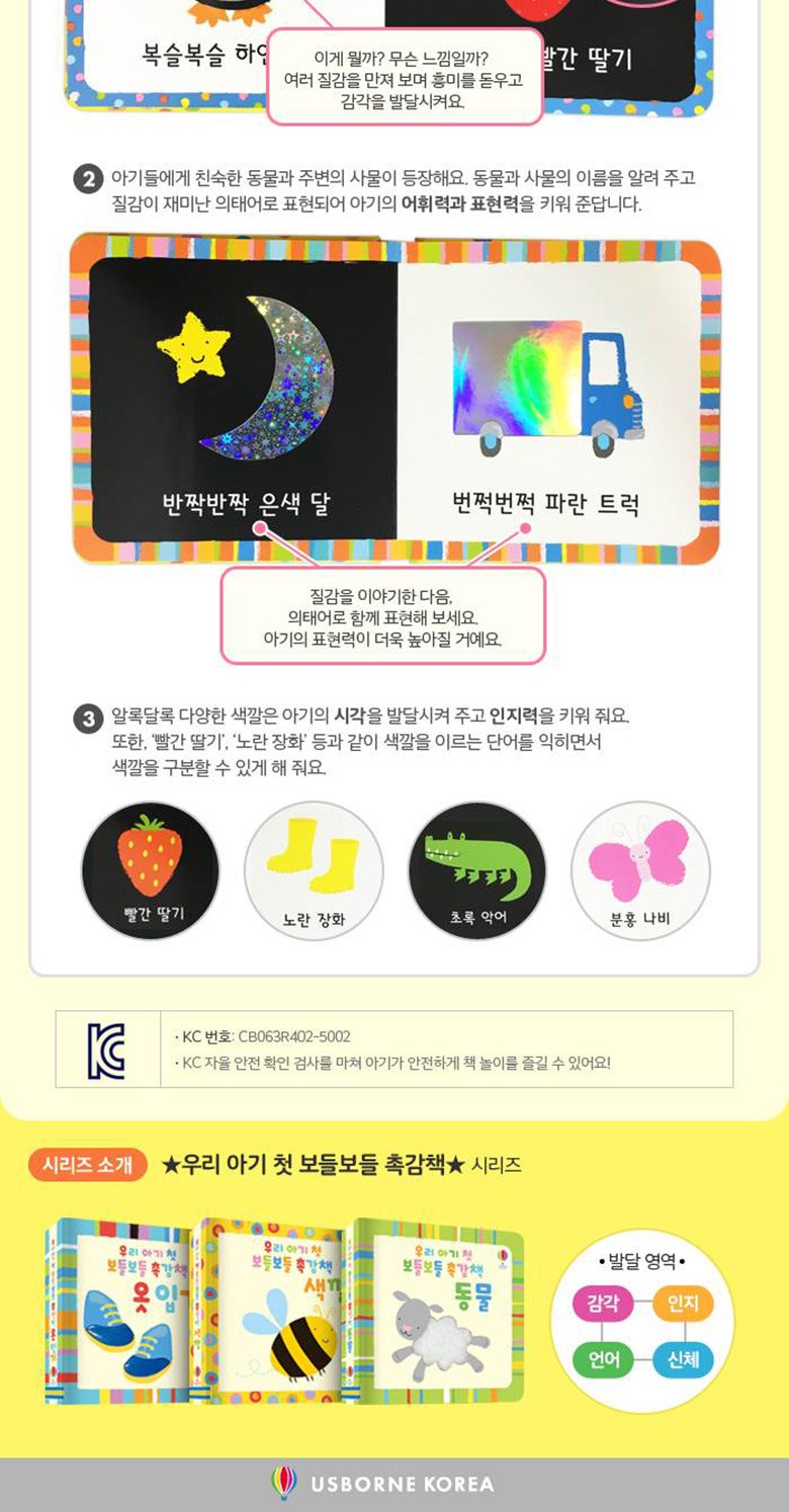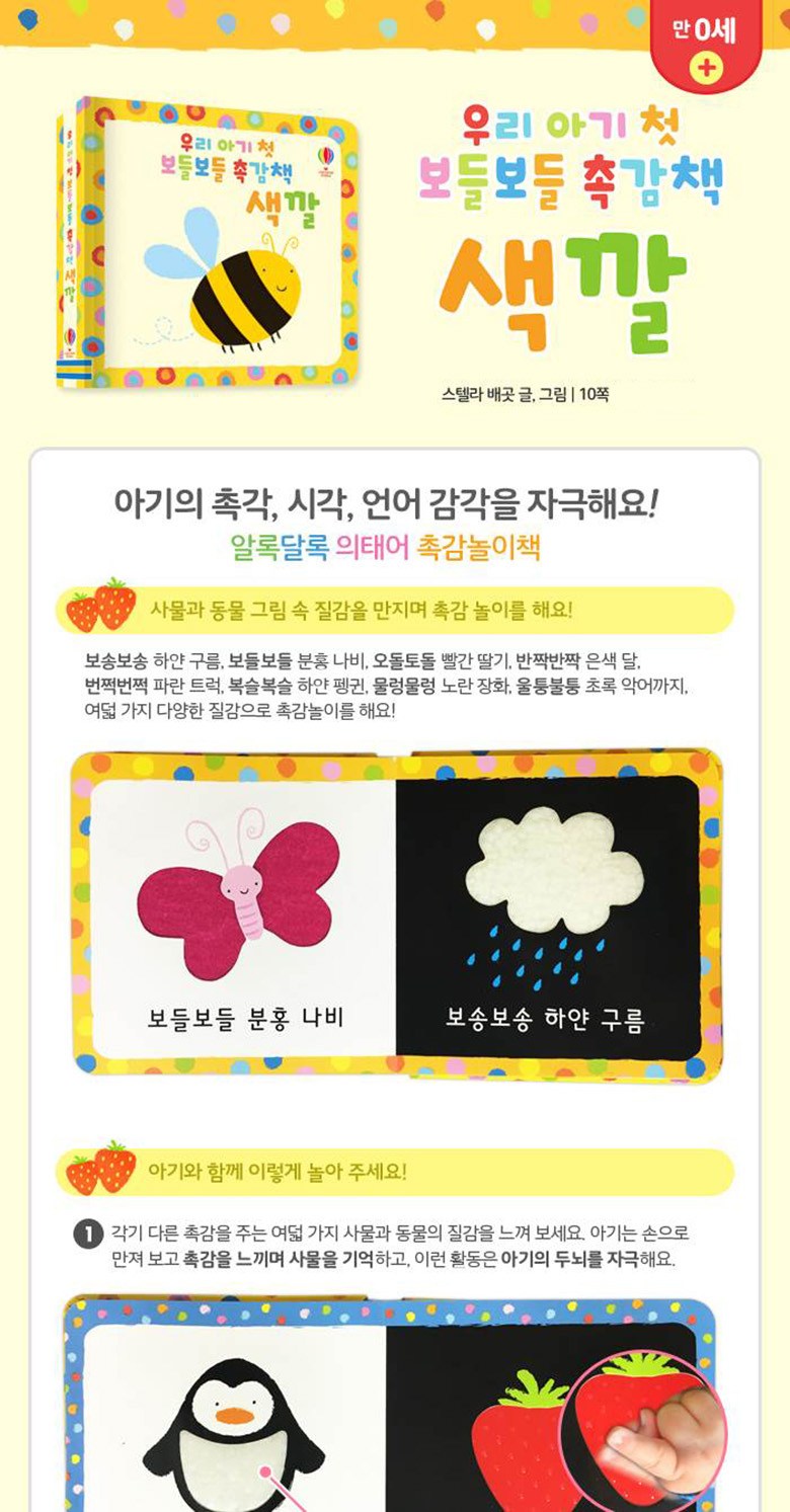 | 목차 또는 책소개(아동용 학습 교재의 경우 사용연령을 포함) | 『우리 아기 첫 보들보들 촉감책: 색깔』을 통해 보송보송 하얀 구름, 보들보들 분홍 나비, 오돌토돌 빨간 딸기, 반짝반짝 은색 달, 번쩍번쩍 파란 트럭, 복슬복슬 하얀 펭귄, 물렁물렁 노란 장화, 울퉁불퉁 초록 악어까지, 여덟 가지 다양한 질감으로 촉감놀이를 즐겨요. 알록달록 사물들의 재미난 의태어를 따라해 보기도 해요. |