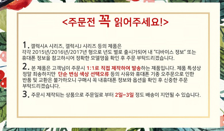 | 소비자상담 관련 전화번호 | 02-2069-2663 공휴일과 주말은 쉽니다. 월요일~금요일 10:00 ~ 15:00 응대가 가능하며, 주문 하시기전에 핸드폰모델명을 확인 후 주문해주시면 감사드리겠습니다. 오주문시, 고객님 귀책으로 왕복배송비 5000원을 내셔야 합니다. 갤럭시A,J의 경우 확인 부탁드립니다. |