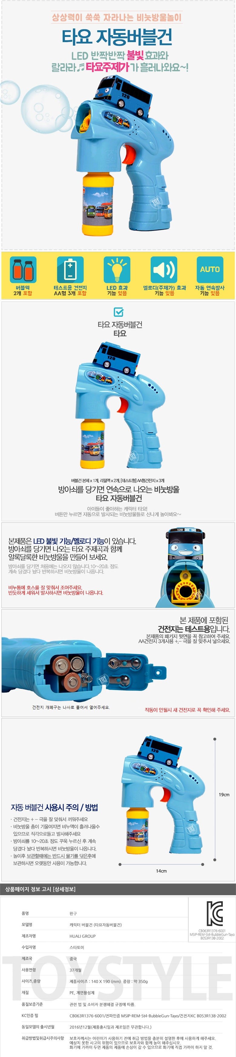 | KC 인증 필 유무 | CB063R1376-6001 MSIP-REM-St4-BubbleGun-Tayo B053R138-2002 |