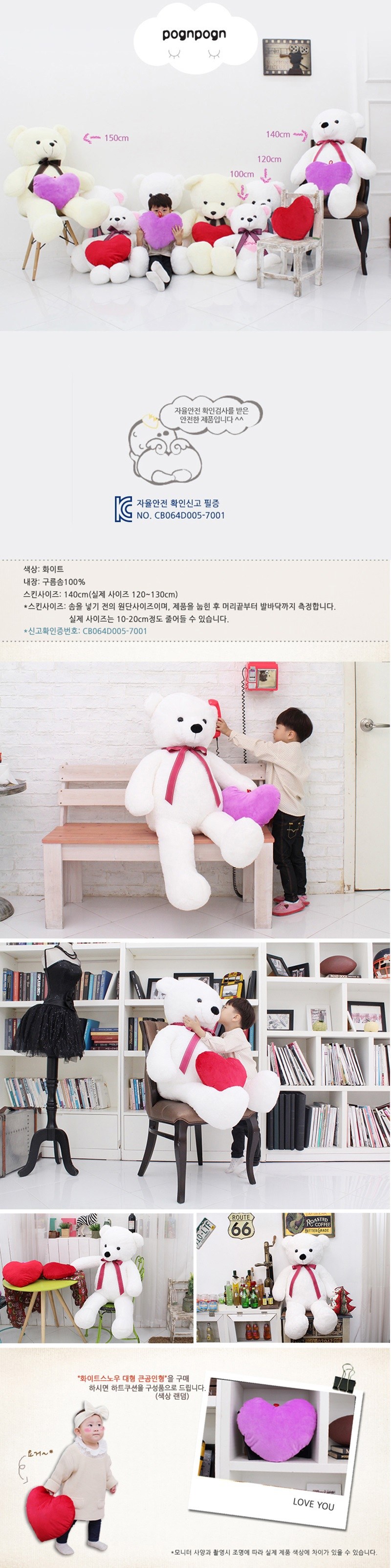 포근포근 스노우 큰곰인형 특대형 + 하트쿠션 랜덤 발송, 140cm, 화이트