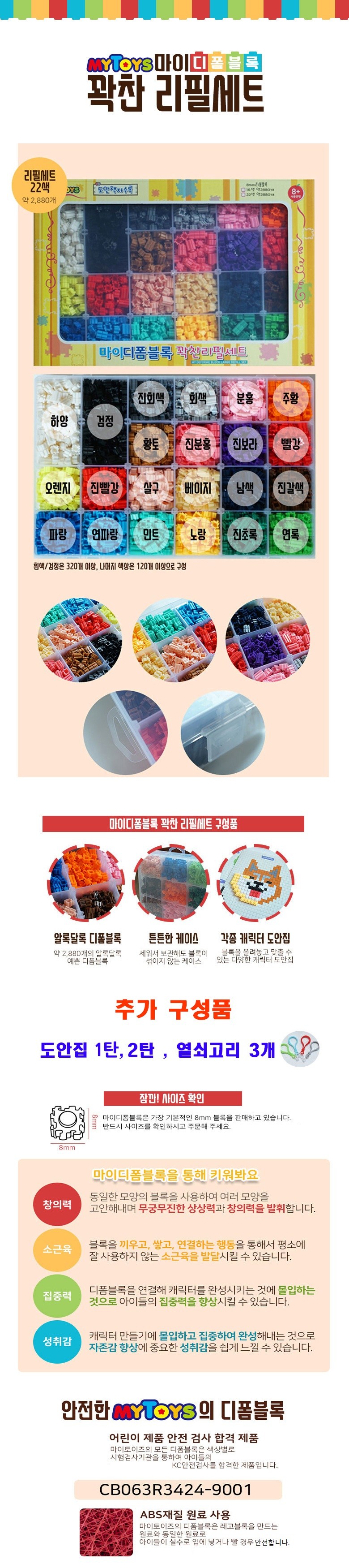 MYTOYS 마이디폼블록 꽉찬 22색 리필 세트 8mm 2880피스 + 도안 1탄 + 2탄 + 열쇠고리 3p