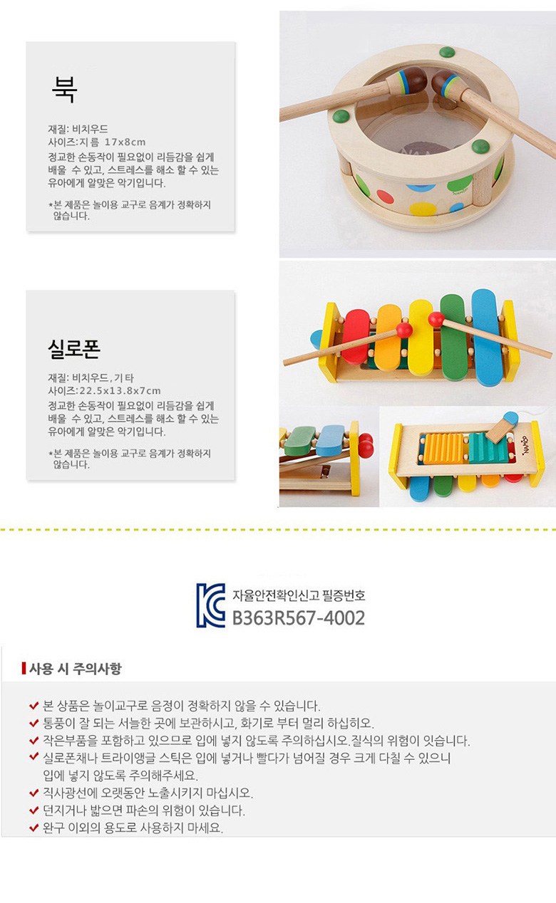 | 취급방법 및 취급시 주의사항, 안전표시 | 본 상품은 놀이교구로 음정이 정확하지 않을 수 있습니다. 통풍이 잘 되는 서늘한 곳에 보관하시고, 화기로 부터 멀리 하십시오. 작은부품을 포함하고 있으므로 입에 넣지 않도록 주의하십시오. 질식의 위험이 있습니다. 실로폰채나 트라이앵글 스틱은 입에 넣거나 빨다가 넘어질 경우 크게 다칠 수 있으니 입에 넣지 않도록 주의해주세요. 직사광선에 오랫동안 노출시키지 마십시오. 던지거나 밟으면 파손의 위험이 있습니다. 완구 이외의 용도로 사용하지 마세요. |