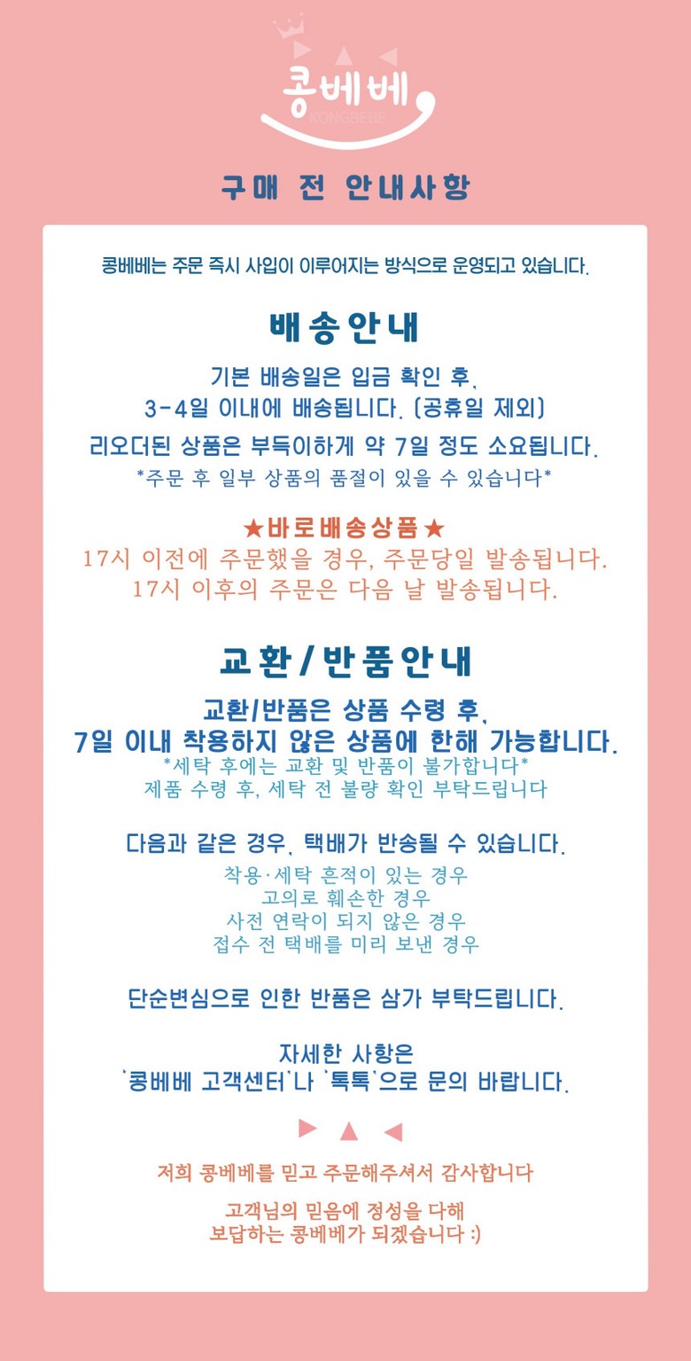 | 세탁방법 및 취급시 주의사항 | *모든 의류의 첫세탁은 찬물세탁을 추천드리며, 건조기 사용시 의류변형 가능성이 높으니 자제를 부탁드립니다 |