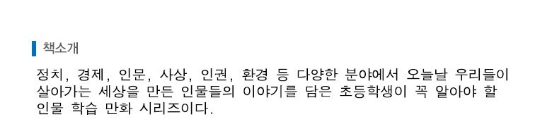 | 목차 또는 책소개(아동용 학습 교재의 경우 사용연령을 포함) | 정치, 경제, 인문, 사상, 인권, 환경 등 다양한 분야에서 오늘날 우리들이 살아가는 세상을 만든 인물들의 이야기를 담은 초등학생이 꼭 알아야 할 인물 학습 만화 시리즈이다. 위대한 인물들의 화려한 업적과 성공보다 그들의 어린 시절을 충실히 담고 있다. |
